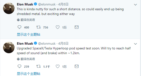 就在4天前,馬斯克還在Twitter上透露:升級后的Hyperloop車廂即將進行測試,超級高鐵的測試時速提升至音速的一半,并嘗試在1.2公里內(nèi)完成剎車。
